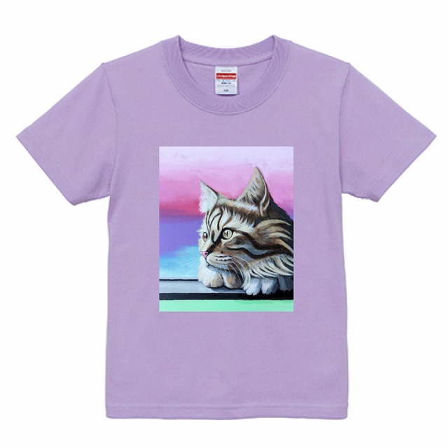 オリジナル絵画の「窓際の猫」のキッズ用のTシャツです。色はライトパープル、定番のUnited Athle 5.6oz Tシャツで素材は綿100%です。